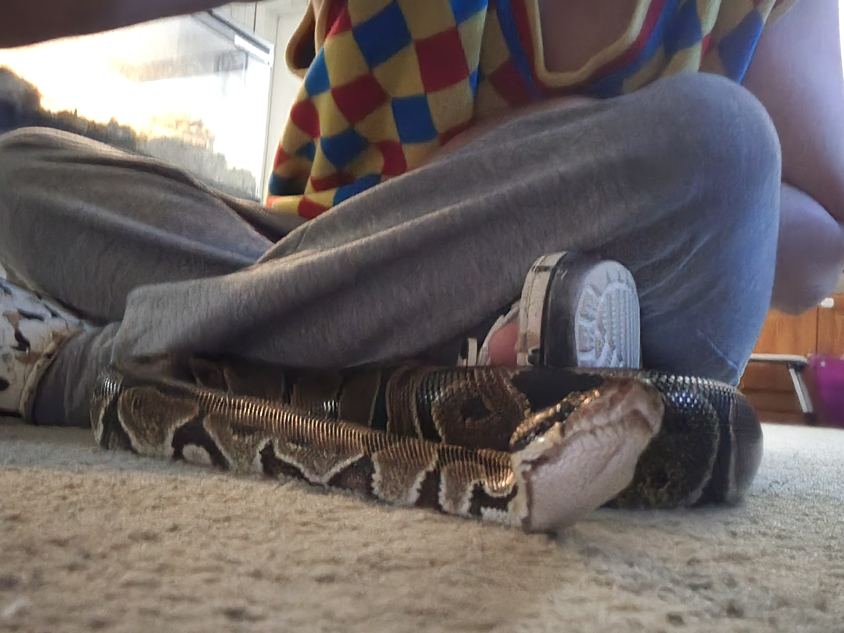 Image Description: An adult normal morph ball python is curled around a transgender man sitting cross-legged on a carpeted floor. The snake is black and brown with a white underbelly, and is looking at the camera. A 40gallon tank can be seen in the background. Please note that Motorbike has a different enclosure that is larger.