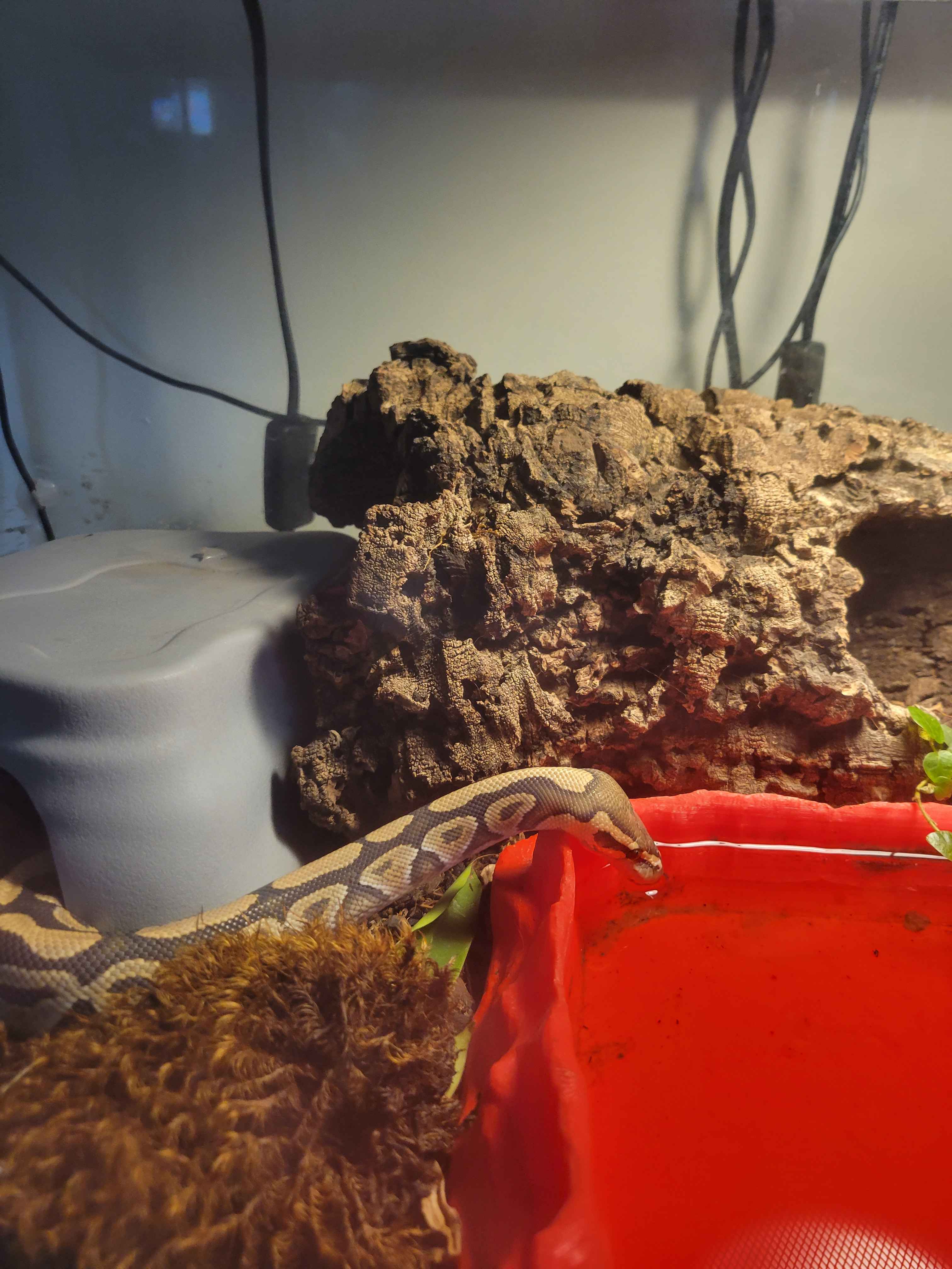 Image Description: A sub-adult hypo/ghost morph ball python taking a sip of water out of a 3D printed red water dish. The snake is grey with yellow patterns. In front of him, there is some live moss. Behind him, his body emerges from a grey hide, and there is a cork bark round in the background.