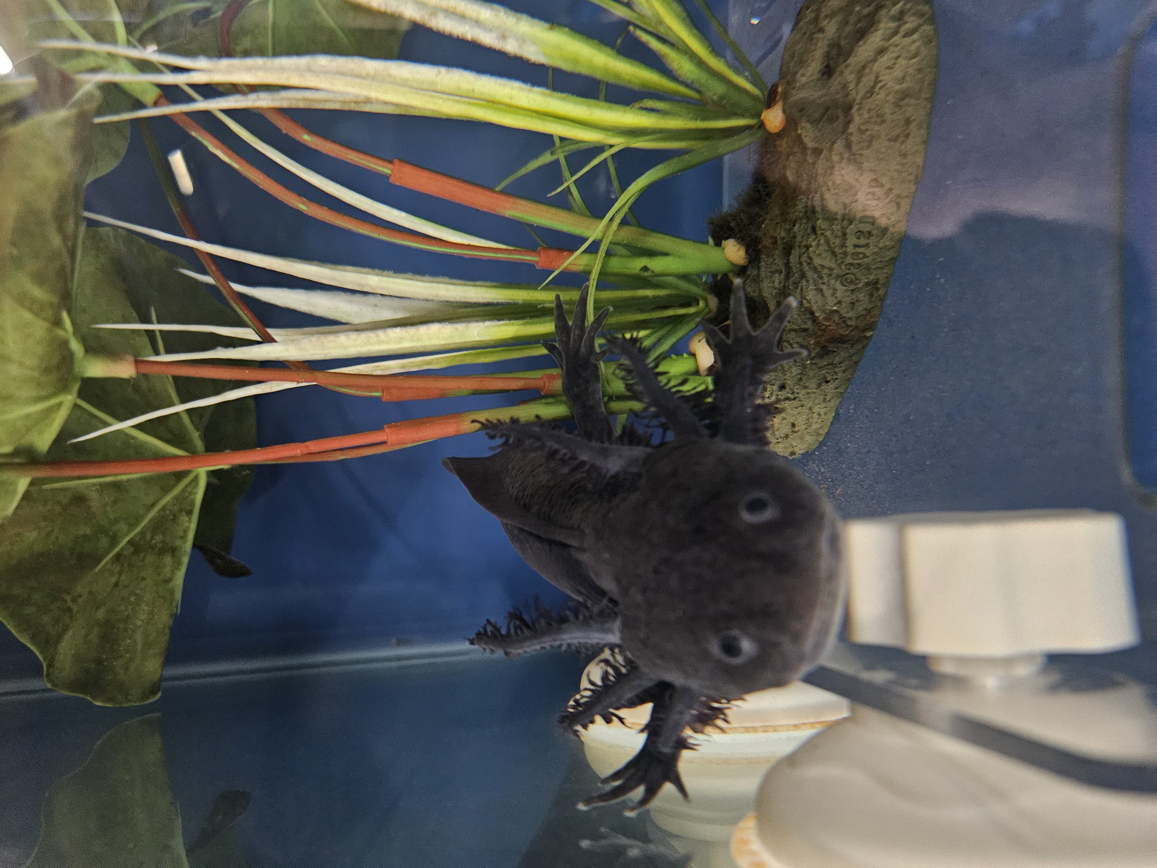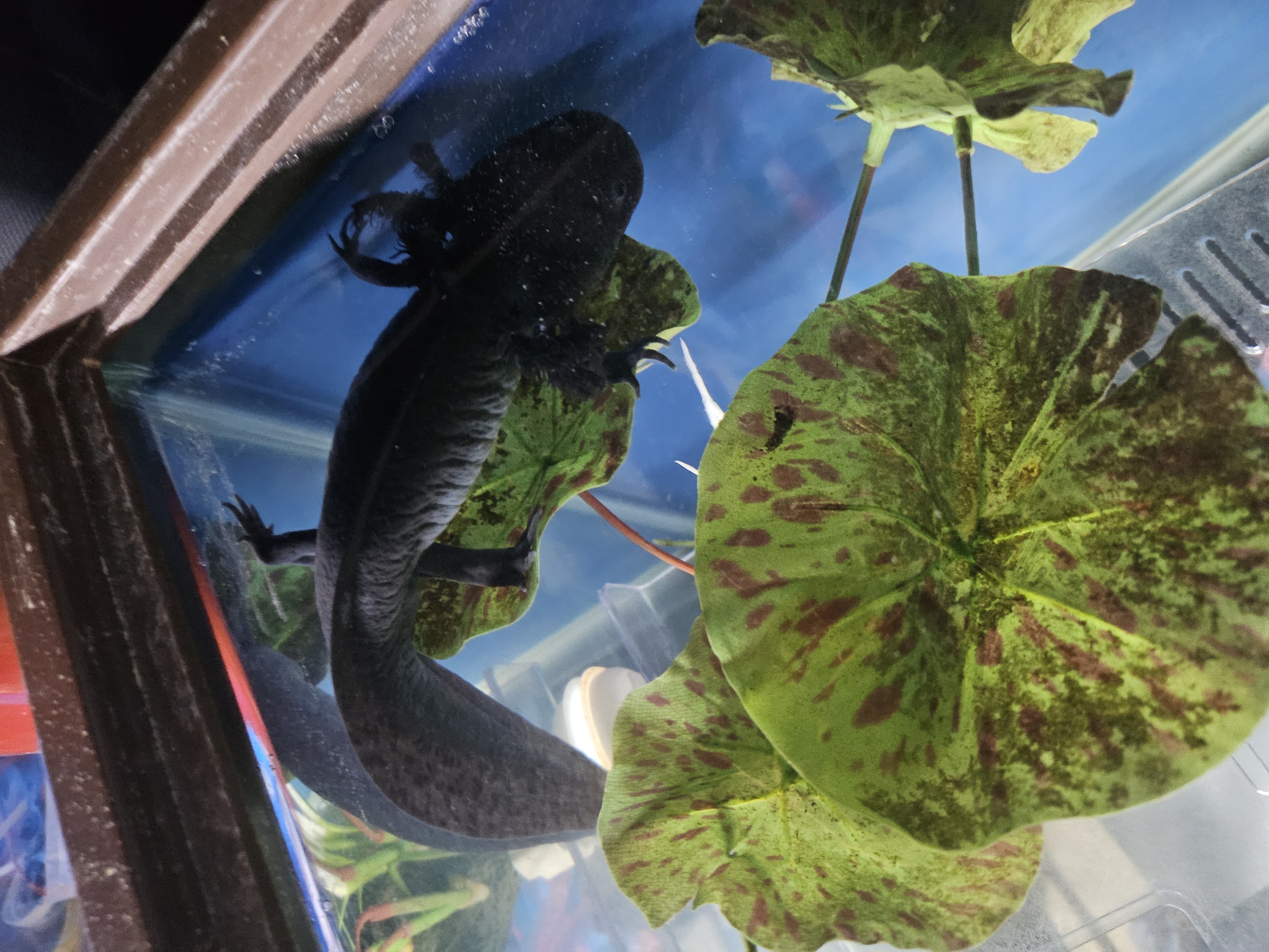 Image description: A large black aquatic salamander standing on a large plastic plant in the corner of an aquarium. Her left feet are against the corner of the glass.