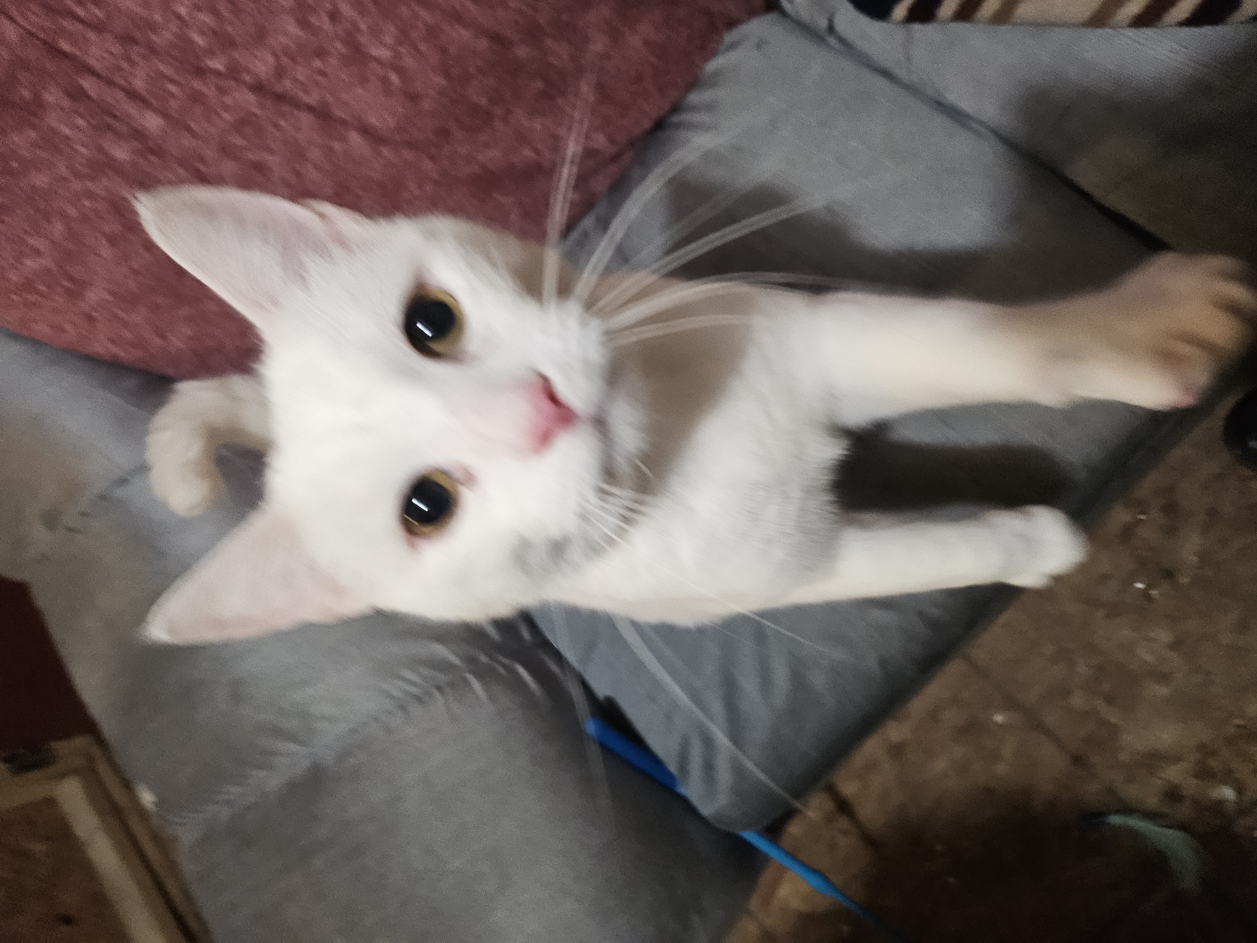 Slightly blurry white cat with yellow eyes standing on his hind legs on a blue couch facing the camera.