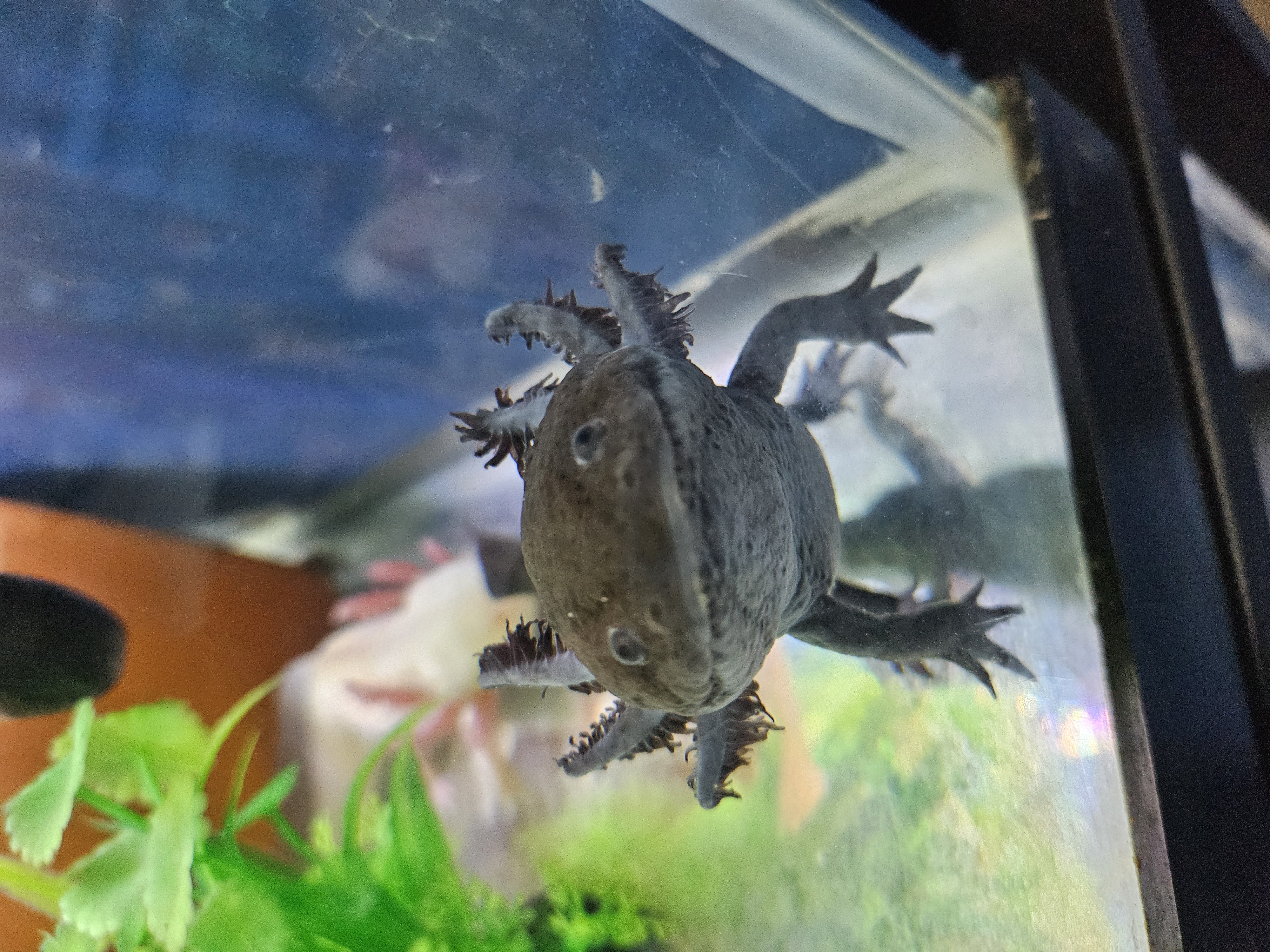 Image Description: Black axolotl with black eyes lying on a transparent platform attatched to the side of the aquarium with his legs splayed out on either side as he faces the camera next to a plastic plant.