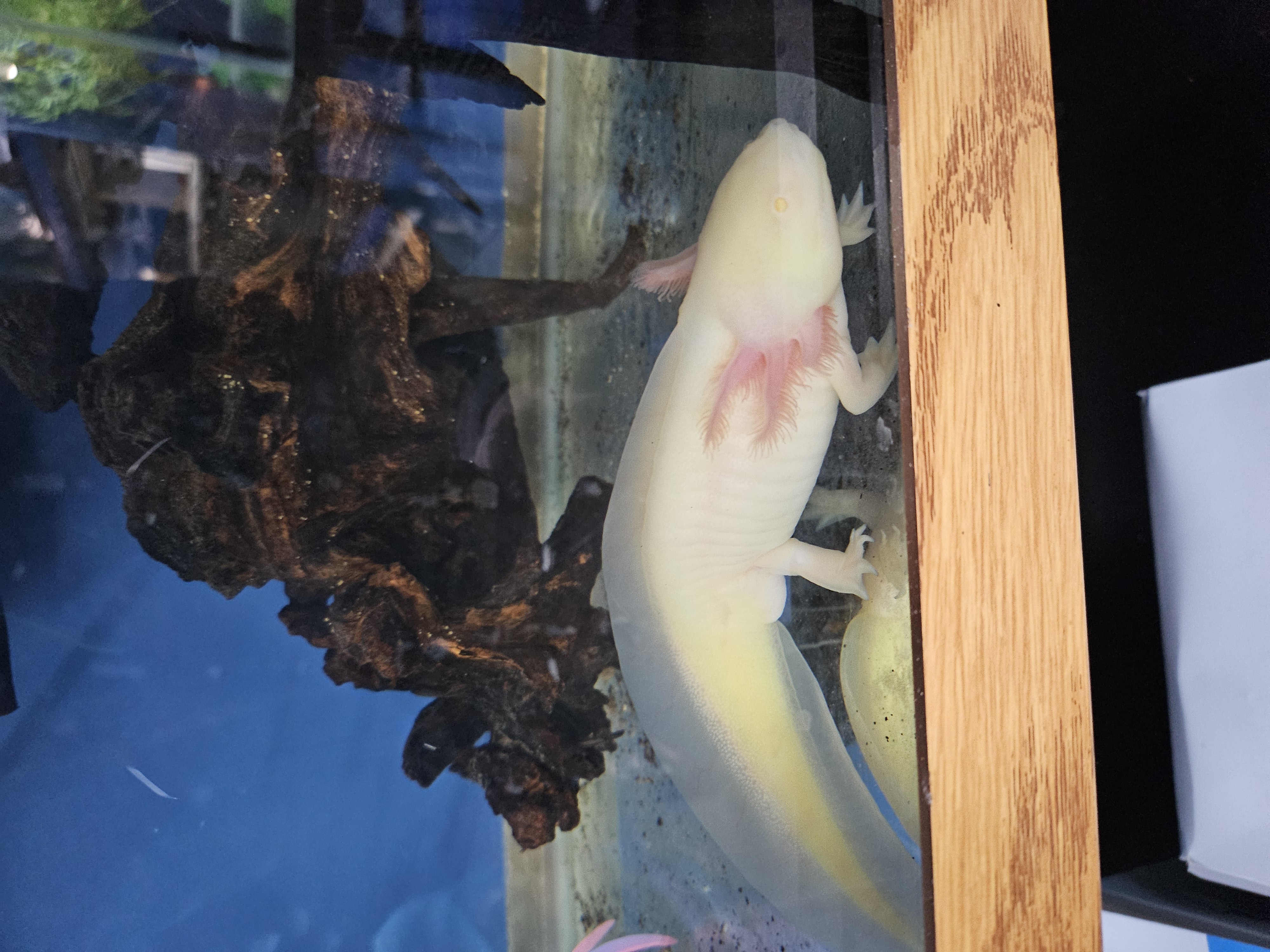 Image Description: Pale yellow axolotl with light pink gills and transparent eyes standing on the floor of an aquarium with a large piece of driftwood behind him.