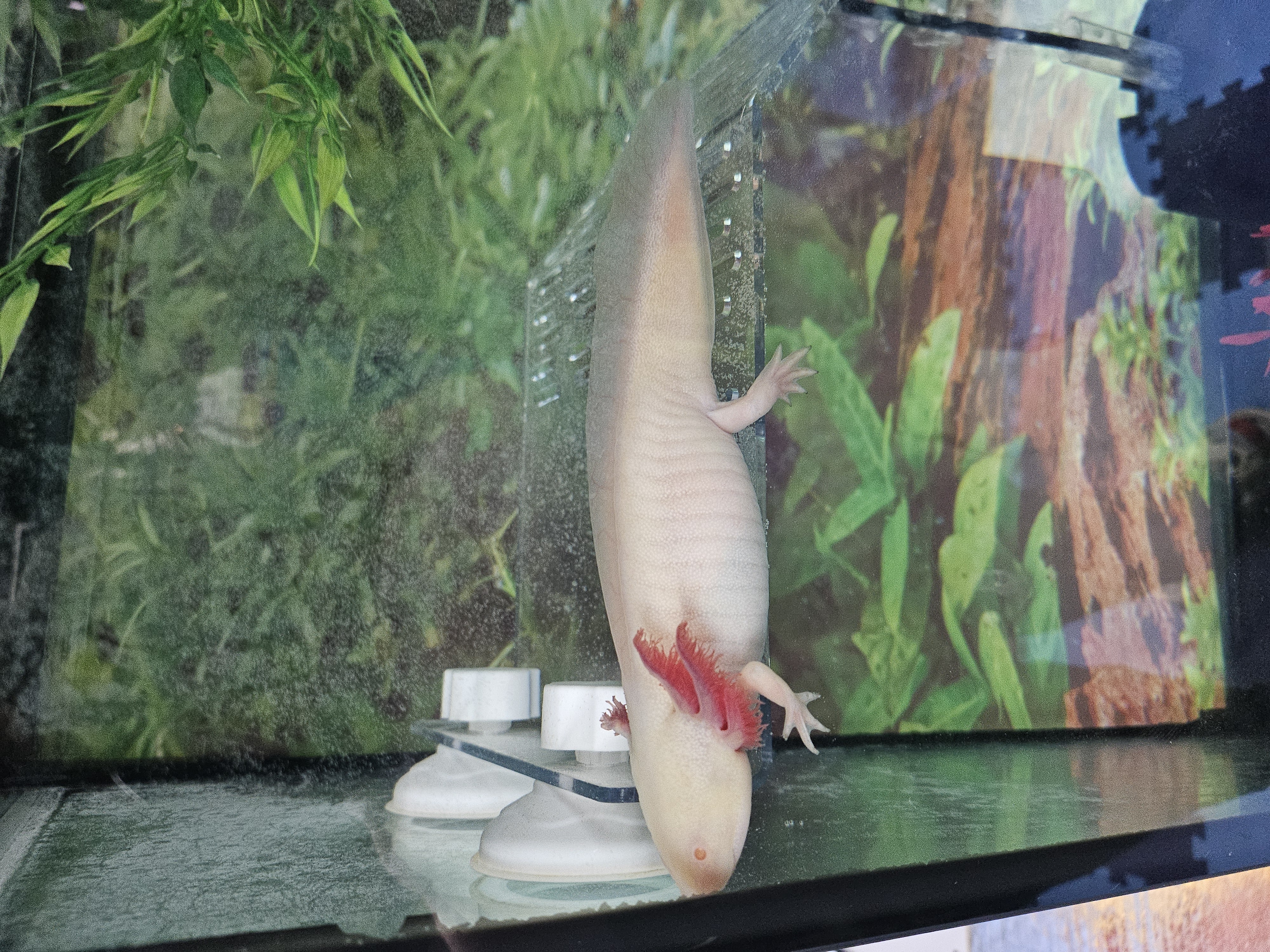 Pale yellow axolotl with red gills and transparent eyes standing on a transparent platform attatched to the side of the aquarium.