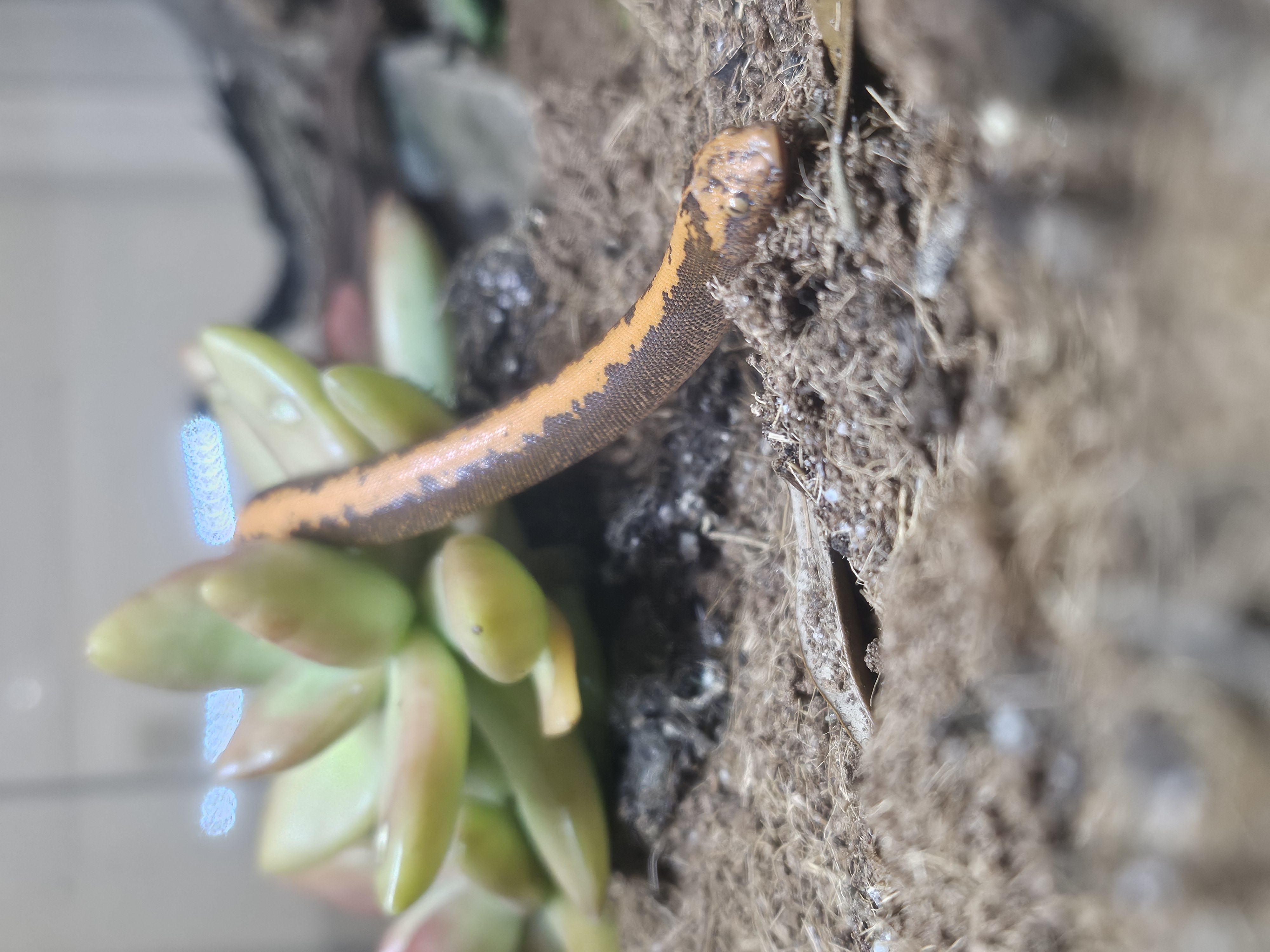 Image Description: A small orange and brown snake faces the camera. His eye is yellow with a black verticle pupil. His face is resting on the dirt. The rest of him is draped over a succulent.