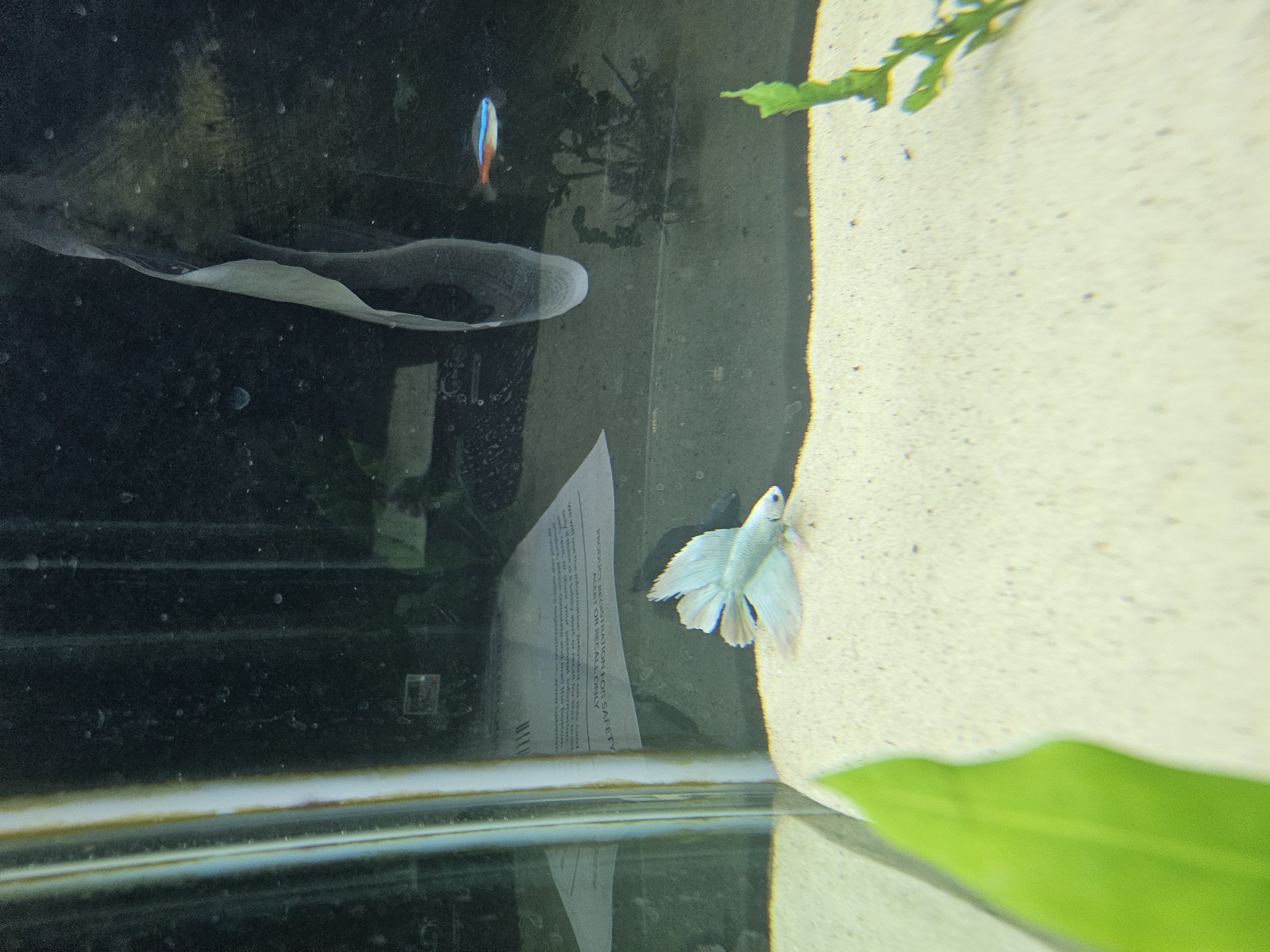 A pale betta fish in the corner of an aquarium resting in the sand. A neon tetra and some aquatic plants can also be seen.