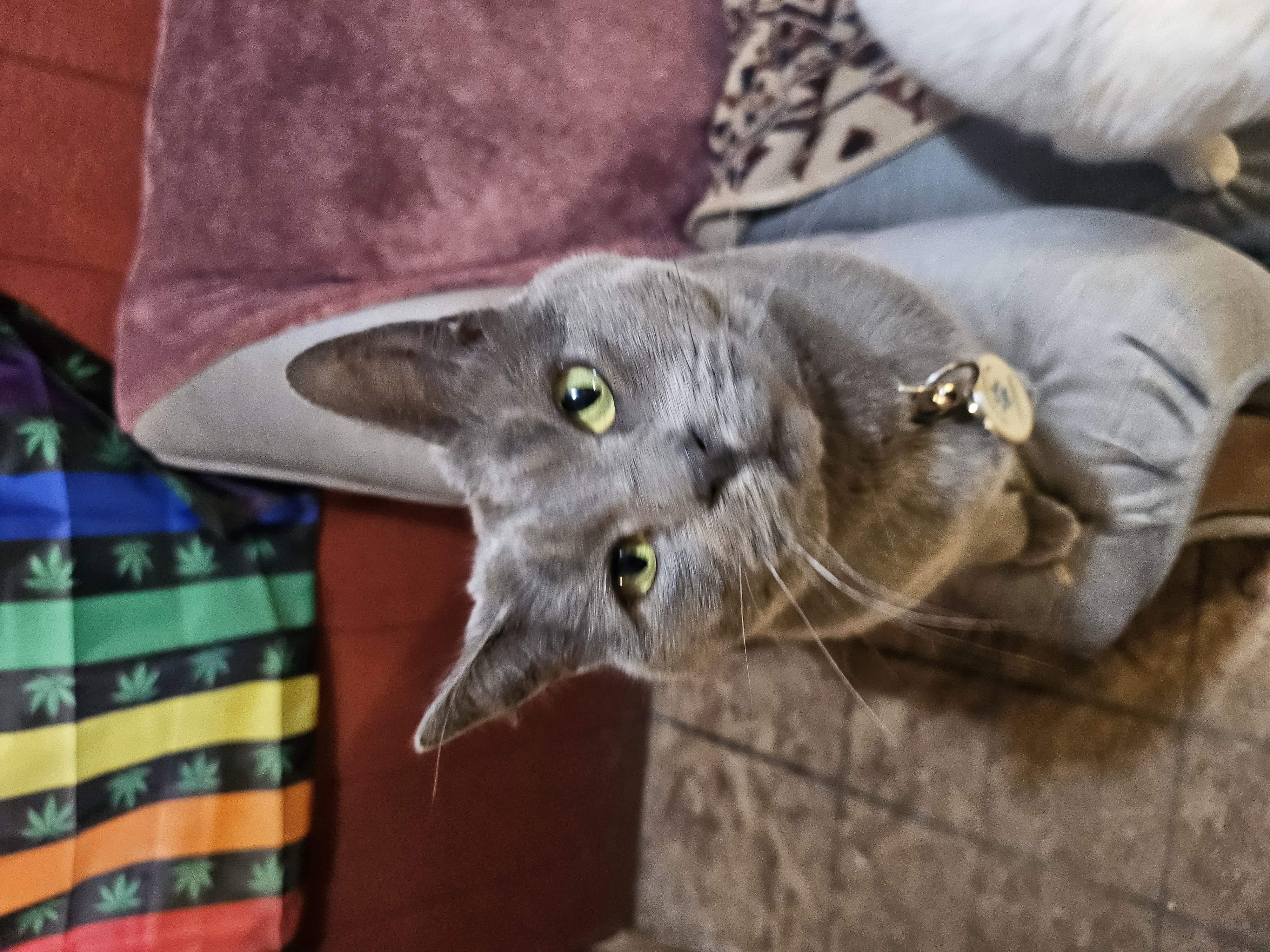 Image Description: Photo of a grey cat with green eyes staring at the camera while perched on the armrest of a blue couch. There is a rainbow-cannabis american flag hanging out in the background.